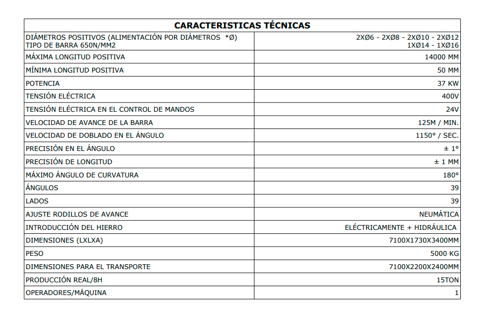 Caracteristicas: alimentacion (una o dos varillas a la vez, conforme al diametro), endereza, corta, dobla uno o ambos extremos y en varios puntos, manda a la unidad de recogida y de ahi se dejan caer (automatica o semiautomaticamente) las barras (rectas o dobladas) a una mesa de 7 u 8 compartimentos (vea foto abajo) desplazable sobre railes para clasificacion y evacuacion.