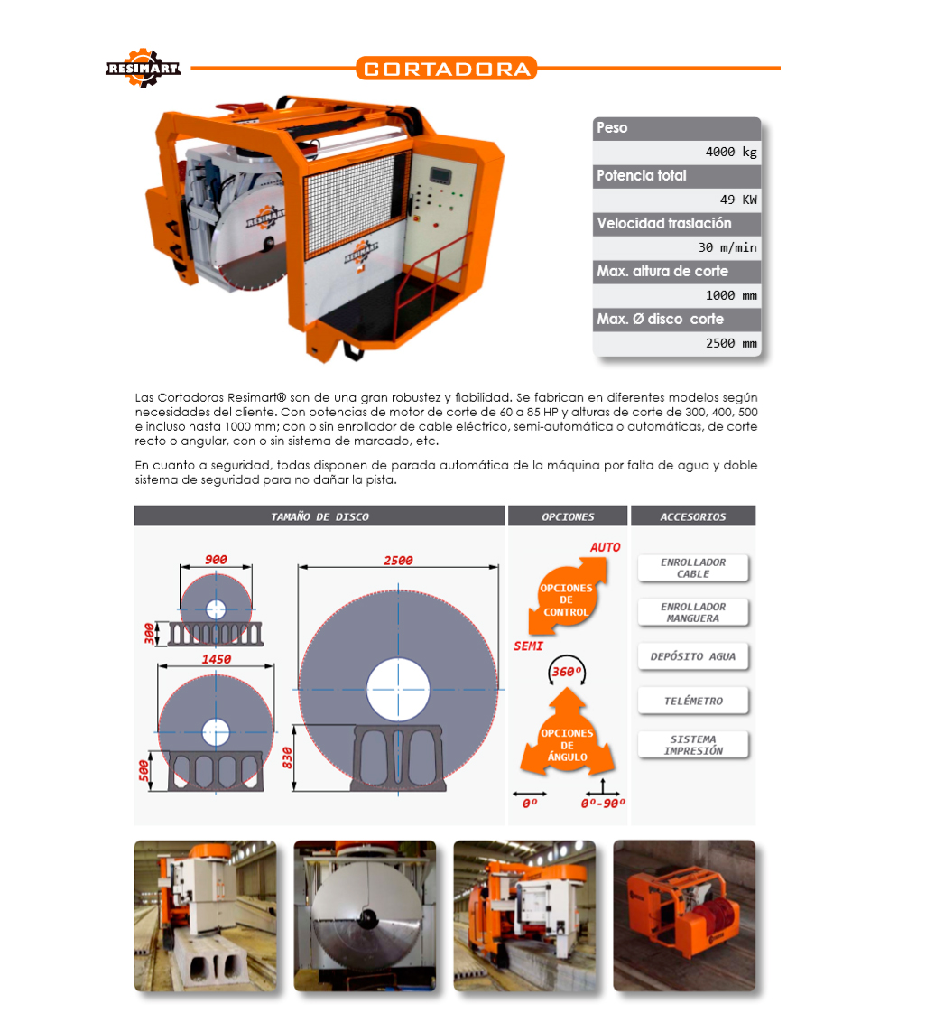 Se fabrican en diferentes modelos según necesidades del cliente. Con potencias de motor de corte de 60 a 85 HP y alturas de corte de 300, 400, 500 e incluso hasta 1000mm; Con o sin enrollador de cable eléctrico, semi-automática o automáticas, de corte recto o angular, con o sin sistema de marcado, etc.